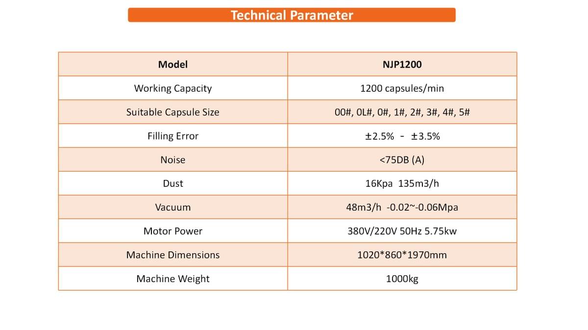NJP-1200 automatic capsule filling machine adopts intermittent rotary operation, orifice plate type dosing filling, precise and compact design, stable and reliable running. It can automatically complete sowing, separating, filling, rejecting, lock capsule and finished product exported and a variety of processes. Fully enclosed ten-station turntable, the module is designed in a single row of 9 holes. It is an intelligent device for the production of hard capsules in the pharmaceutical and food industries.
