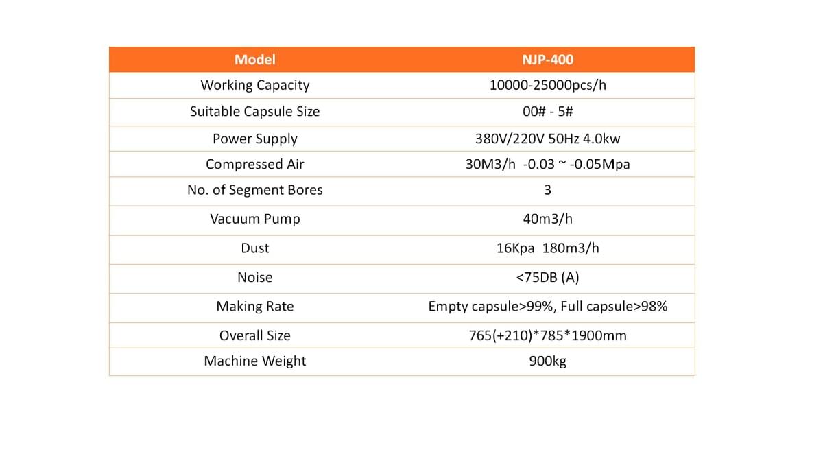 NJP-400 automatic capsule filling machine adopts intermittent rotary operation, orifice plate type dosing filling, precise and compact design, stable and reliable running. It can automatically complete sowing, separating, filling, rejecting, lock capsule and finished product exported and a variety of processes. Fully enclosed ten-station turntable, the module is designed in a single row of 3 holes, becoming the first choice for hard capsule filling equipment in either hospitals or medium and small-sized pharmaceutical companies.
