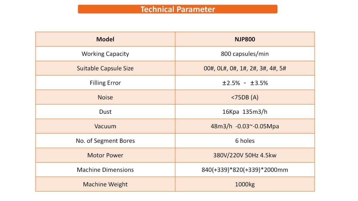 NJP-800 automatic capsule filling machine adopts intermittent rotary operation, orifice plate type dosing filling, precise and compact design, stable and reliable running. It can automatically complete sowing, separating, filling, rejecting, lock capsule and finished product exported and a variety of processes. Fully enclosed ten-station turntable, the module is designed in a single row of 6 hole, becoming the first choice for hard capsule filling equipment for pharmaceuticals, health care products and other manufacturing companies.
